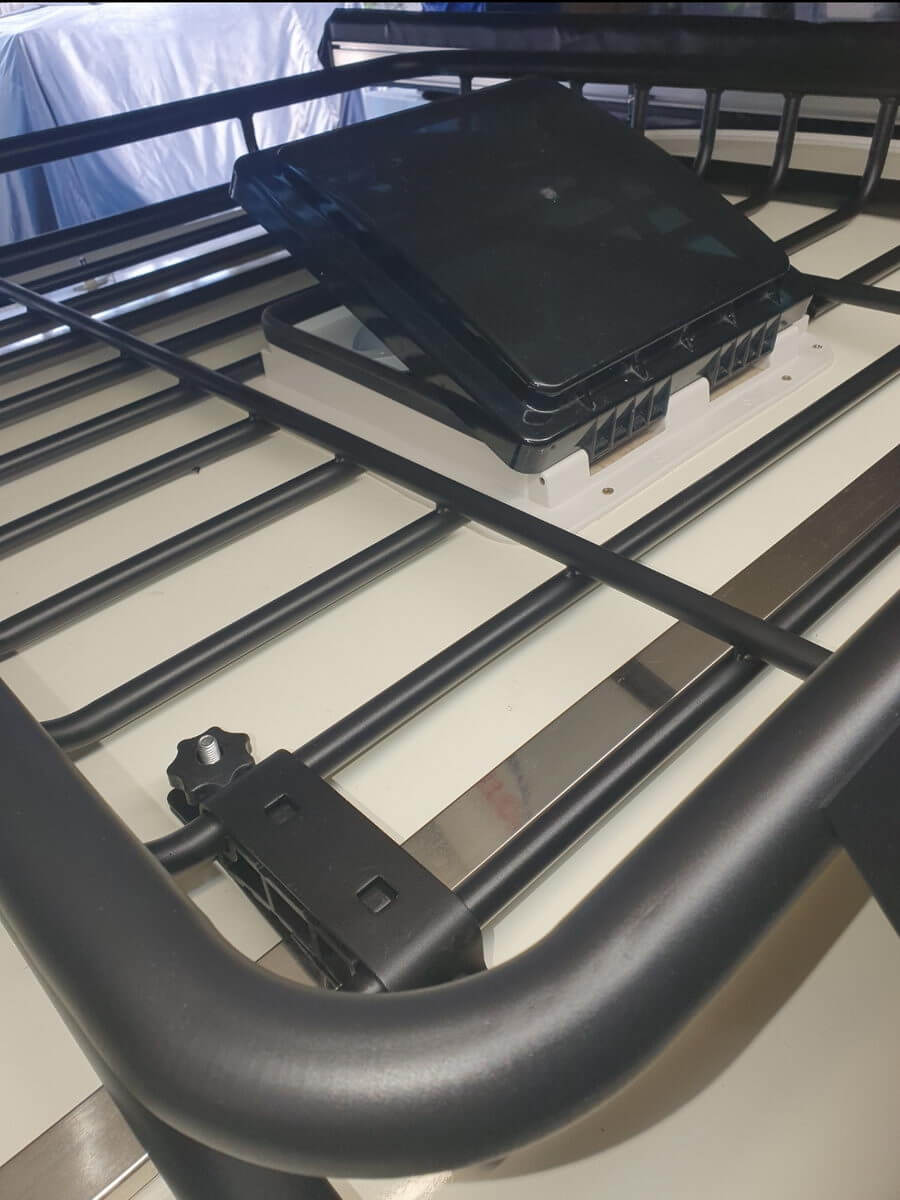 Solid chassis, 15-inch rugged wheels, stabiliser legs and a roof rack for all your gear